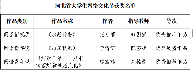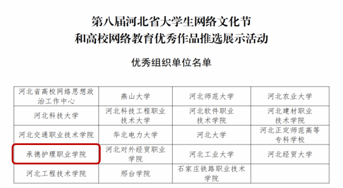 近日,河北省教育厅、中共河北省委网信办发布了第八届河北省大学生网络文化节和高校网络教育优秀作品推选展示活动结果,我院在此次活动中表现突出,共8项优秀作品荣获奖项,同时我院被评选为“优秀组织单位”。