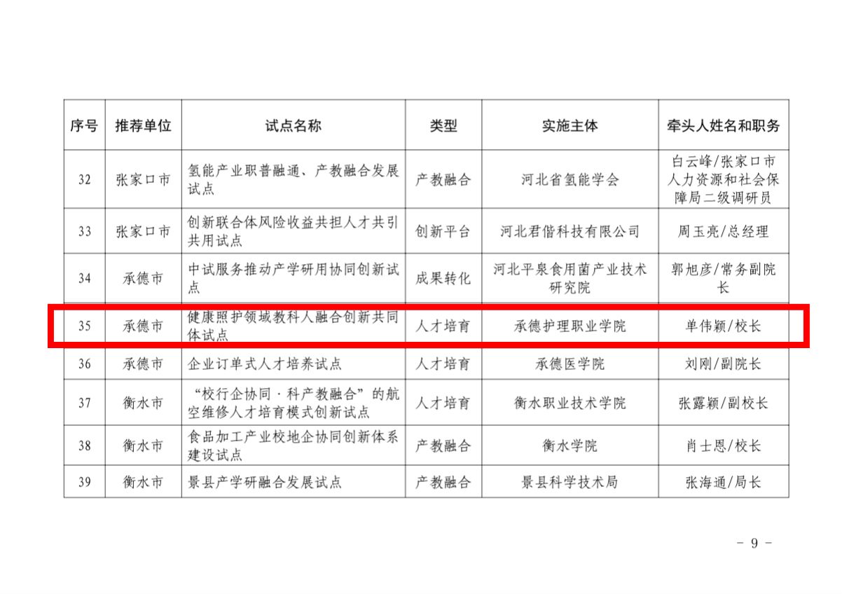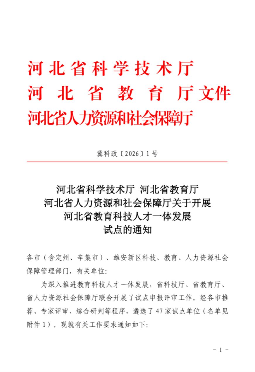 近日,河北省科学技术厅、河北省教育厅、河北省人力资源和社会保障厅联合印发通知,正式公布河北省教育科技人才一体发展试点单位遴选结果,我院院长单伟颖牵头申报的“健康照护领域教科人融合创新共同体试点”项目成功入选试点名单。