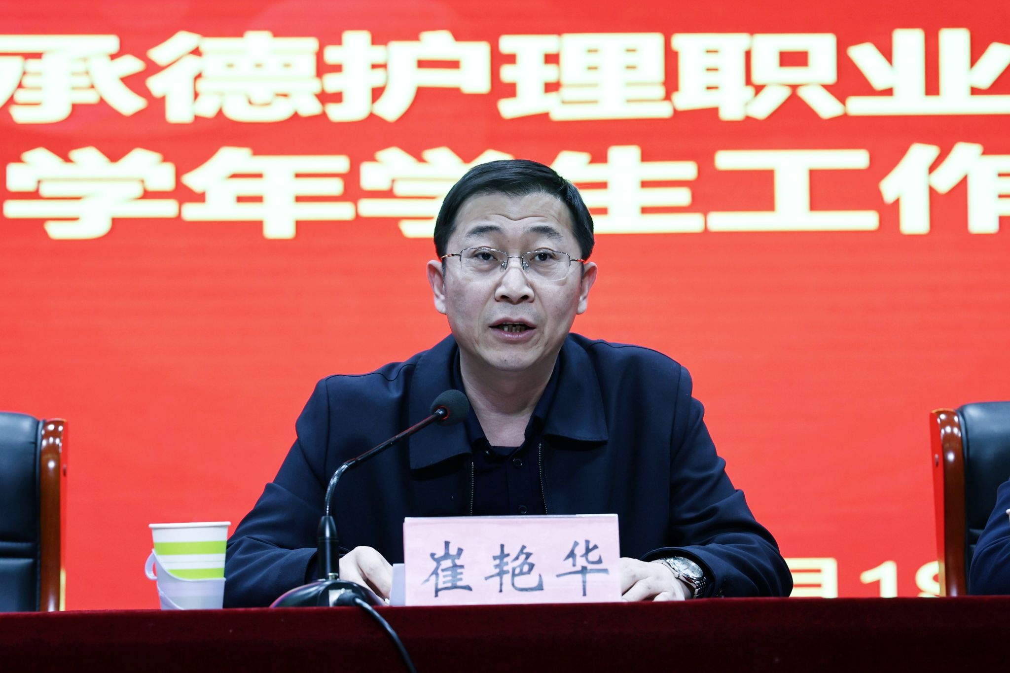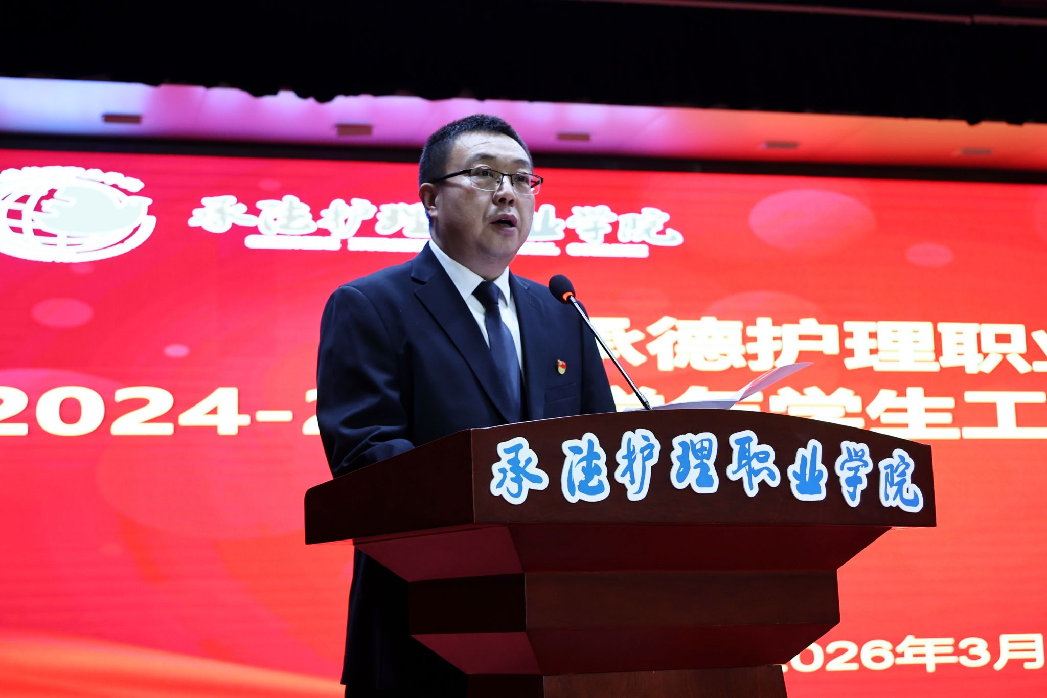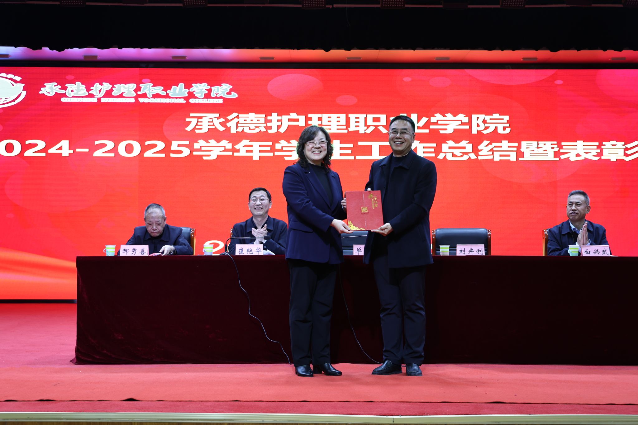 崔艳华在大会上号召全体师生以表彰大会为新起点,向先进典型学习,牢记“尚德、笃学、慎行、奉献”的校训,传承塞罕坝精神,努力成长为德技兼修的高素质医疗卫生技术技能人才,共同书写学院高质量发展新篇章。