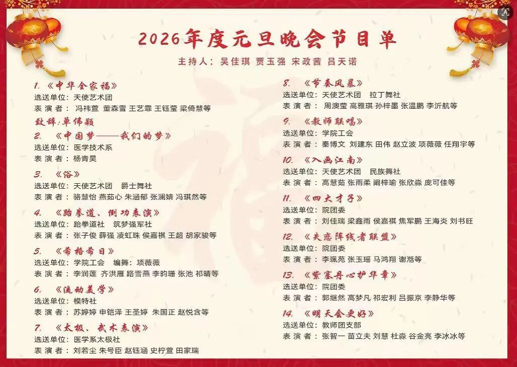 灵蛇摆尾辞旧岁,骏马踏春启新程。在这蛇年收官、马年将至的美好节点,FUN乐天使官方网站于12月30日下午在五楼会议厅隆重举办2026年元旦联欢晚会。全院师生欢聚一堂,以歌舞寄情、以才艺表意,在辞旧迎新的喜庆氛围中,共同定格这场兼具青春活力与家国情怀的视听盛宴。