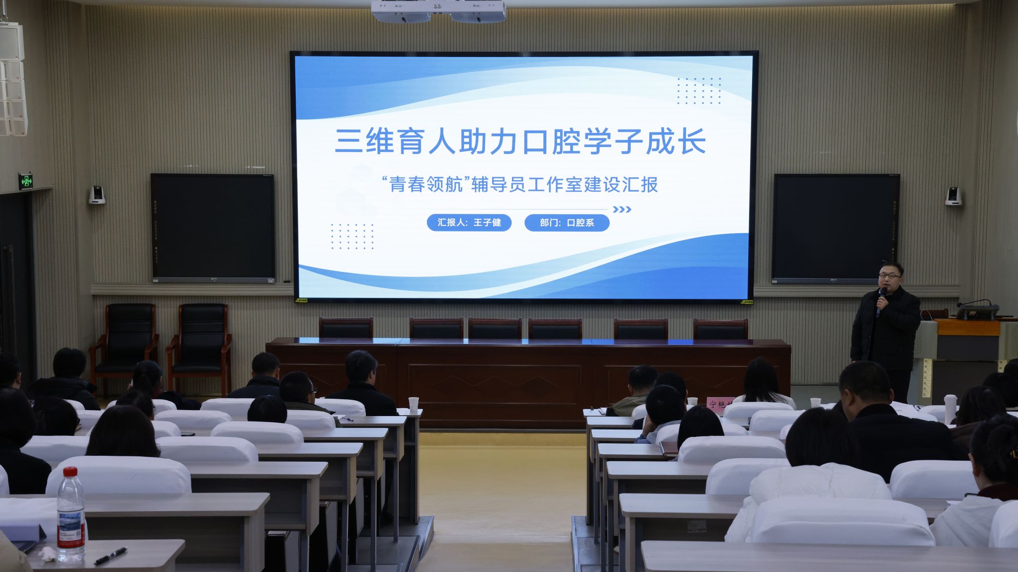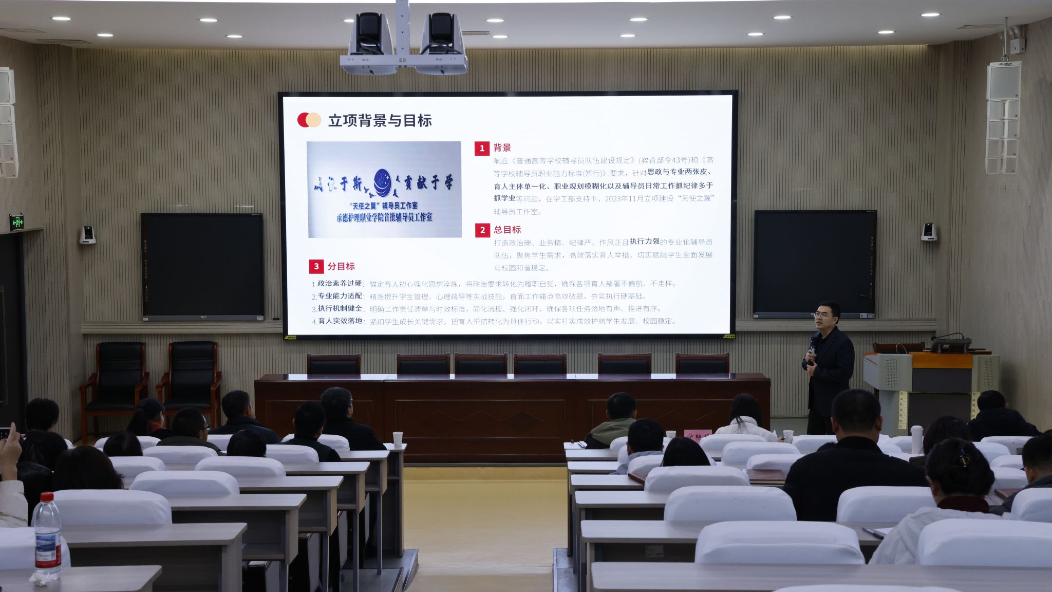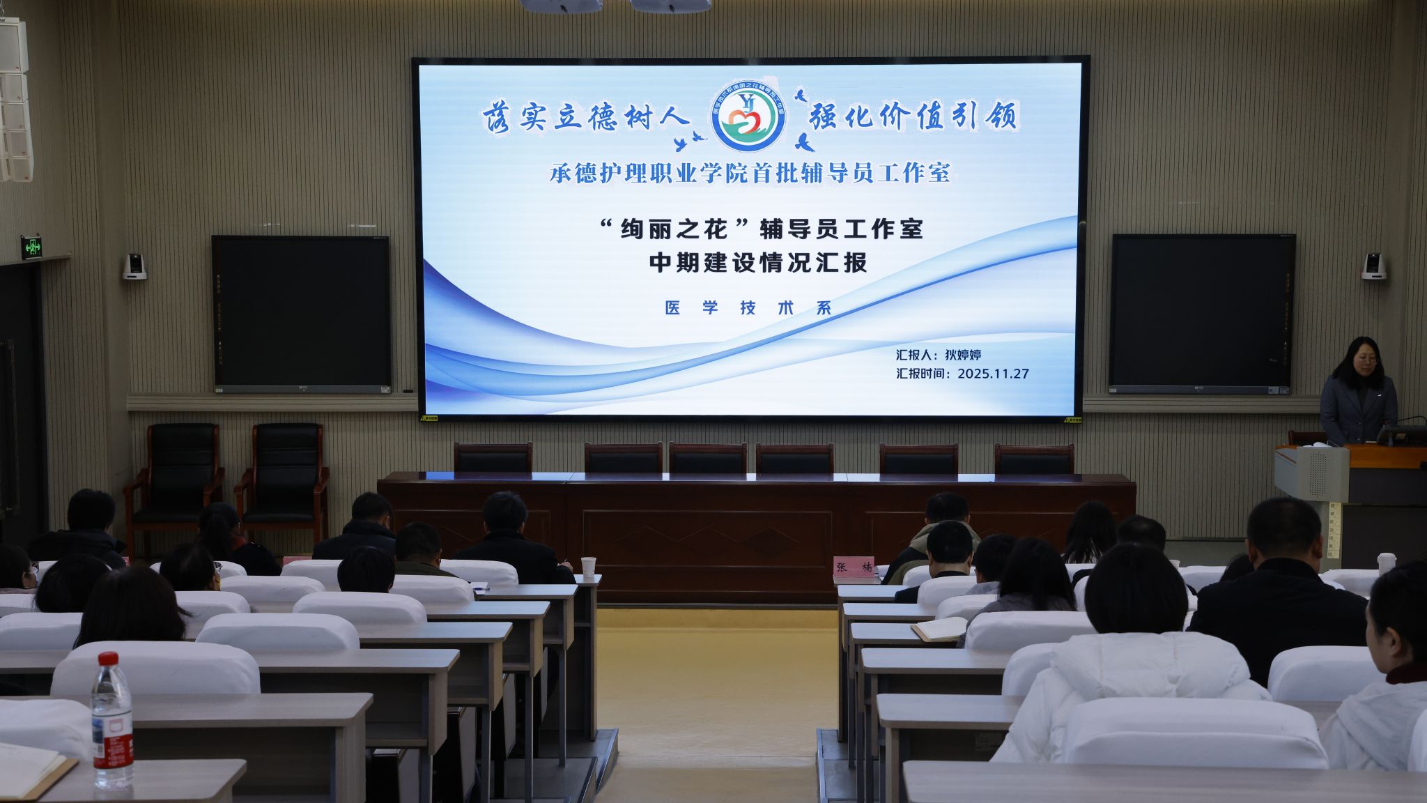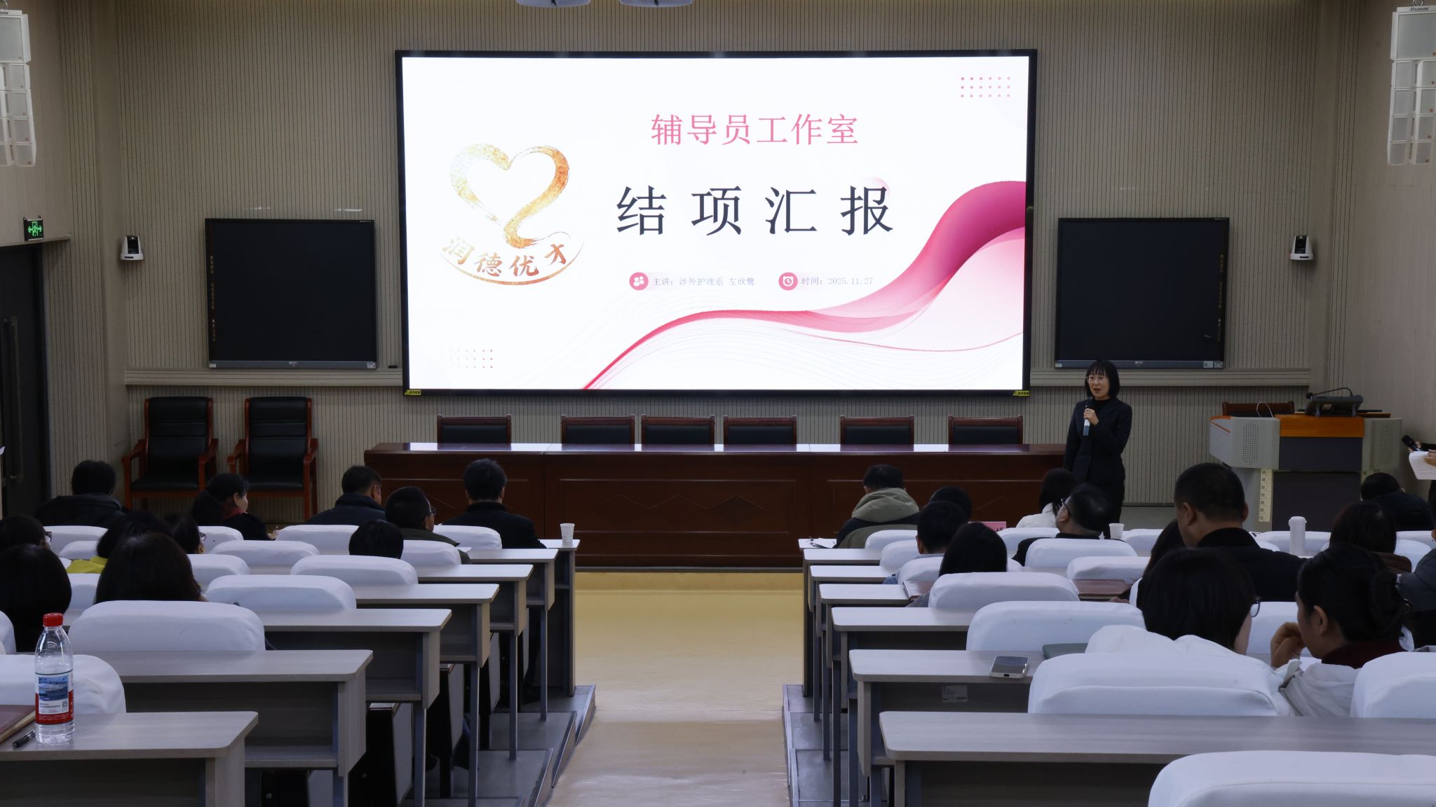 此次汇报会聚焦学校首批立项建设的四个辅导员工作室,分别是“绚丽之花”辅导员工作室、“润德优才”辅导员工作室、“天使之翼”辅导员工作室以及“青春领航”辅导员工作室。各工作室主持人围绕团队建设与制度完善、科研成果与实践创新、学生服务成效及影响力、特色经验总结与未来规划等多个维度,全面且深入地总结了工作室的建设情况。他们以详实的数据、生动的案例和深刻的思考,展示了工作室在育人工作中的积极探索与丰硕成果,并进行了一场精彩的汇报答辩,充分展现了辅导员队伍的专业素养与育人热情。
