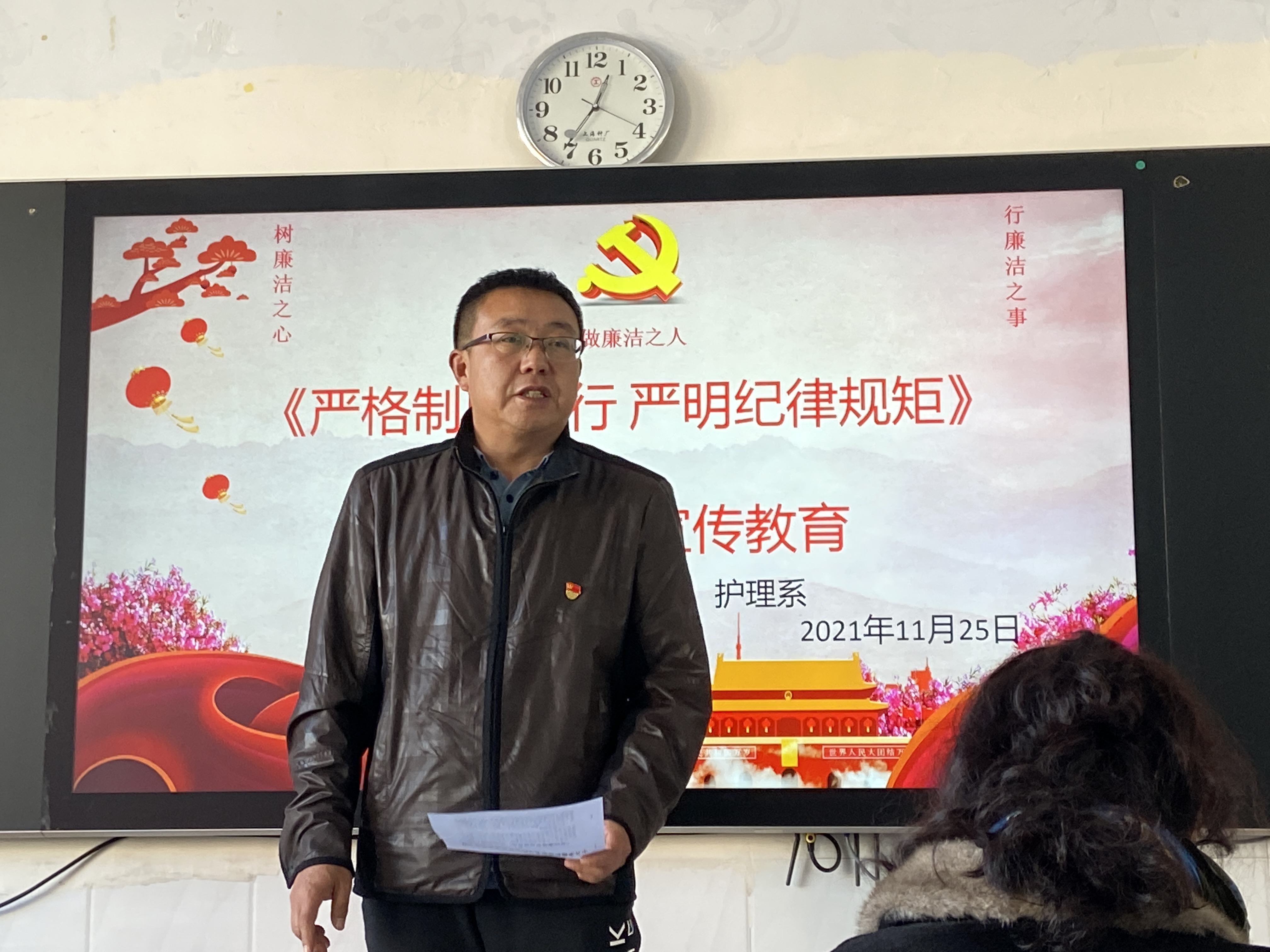 为推动党风廉政建设及反腐败工作深入开展,持续深化纠正“四风”和作风纪律专项整治,按照学校相关文件要求, 11月25日中午,护理系党总支组织全体党员在2号教学楼第12教室开展了关于“严格制度执行 严明纪律规矩”的党风廉政宣传教育学习活动。