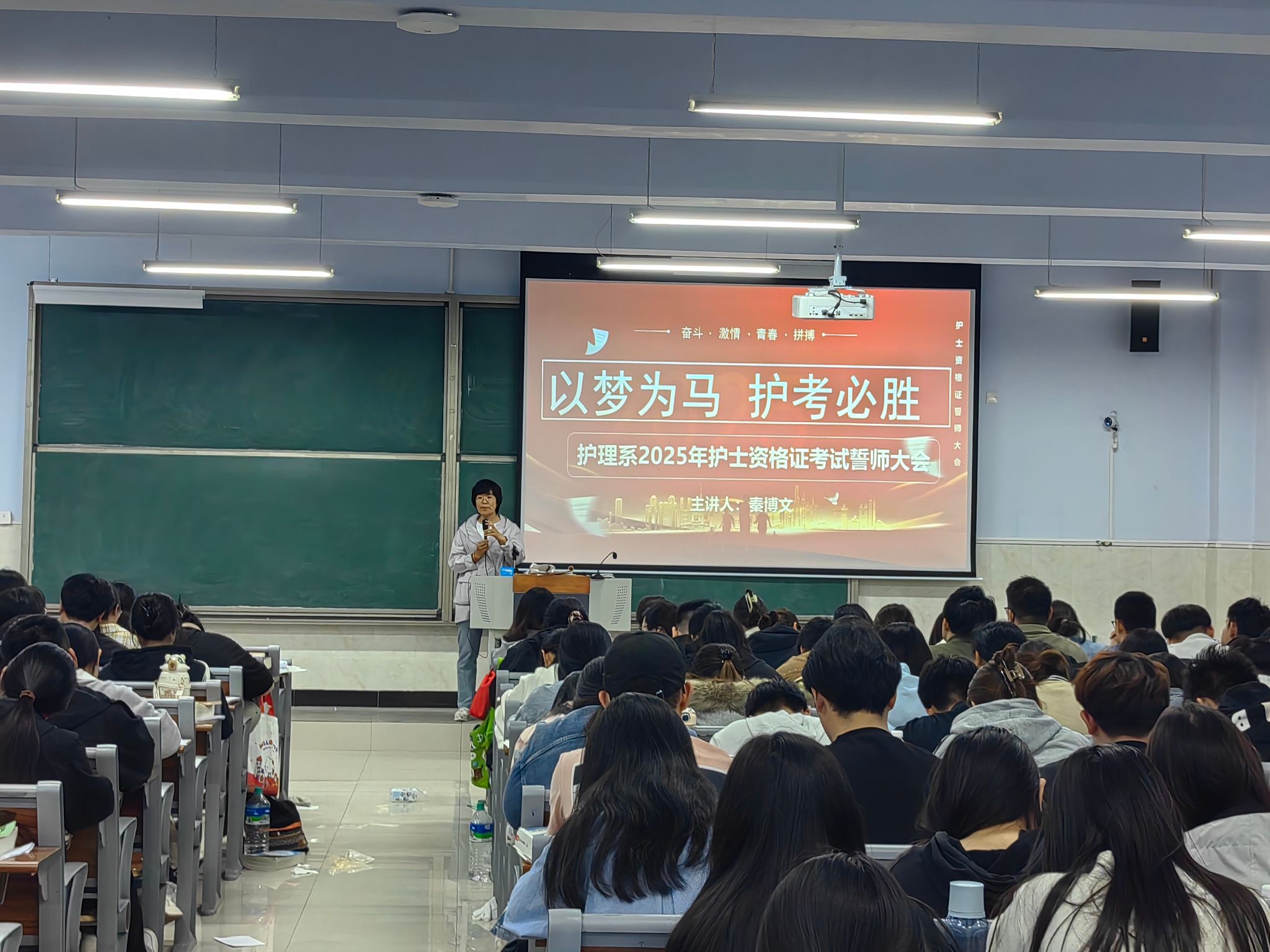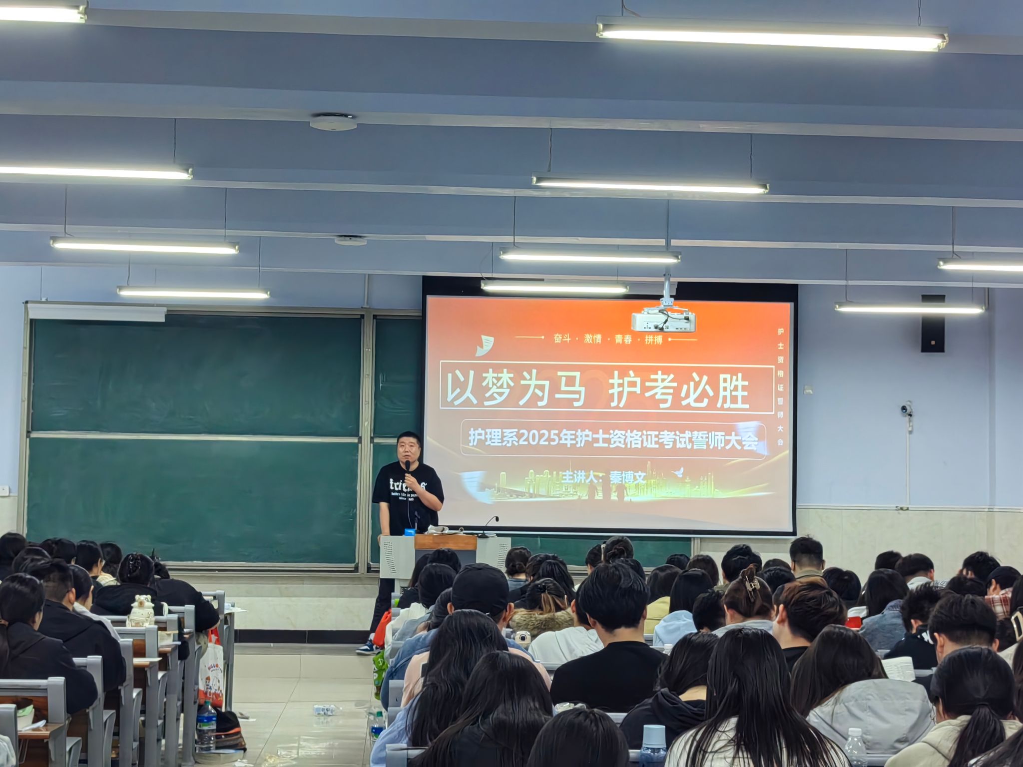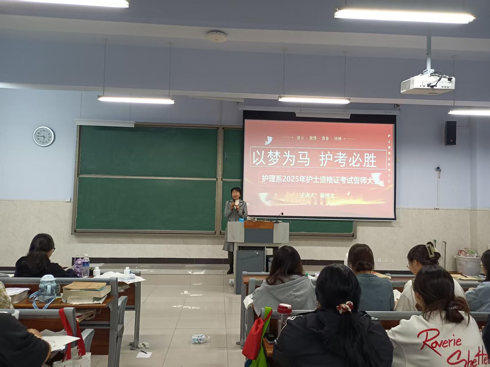 为鼓舞护理系学子备考士气,助力其在2025年护士执业资格考试中取得优异成绩,4月23日晚19点,护理系在第7公共教室召开以“以梦为马,护考必胜”为主题的2025年护考考前誓师大会。护理系主任秦博文、副主任张爱东、护资辅导负责人韩笑、辅导员及辅导教师代表与2022级护理、2022级助产部分返校参加辅导的170余名学生齐聚一堂,共启这场备考冲刺的动员盛会。
