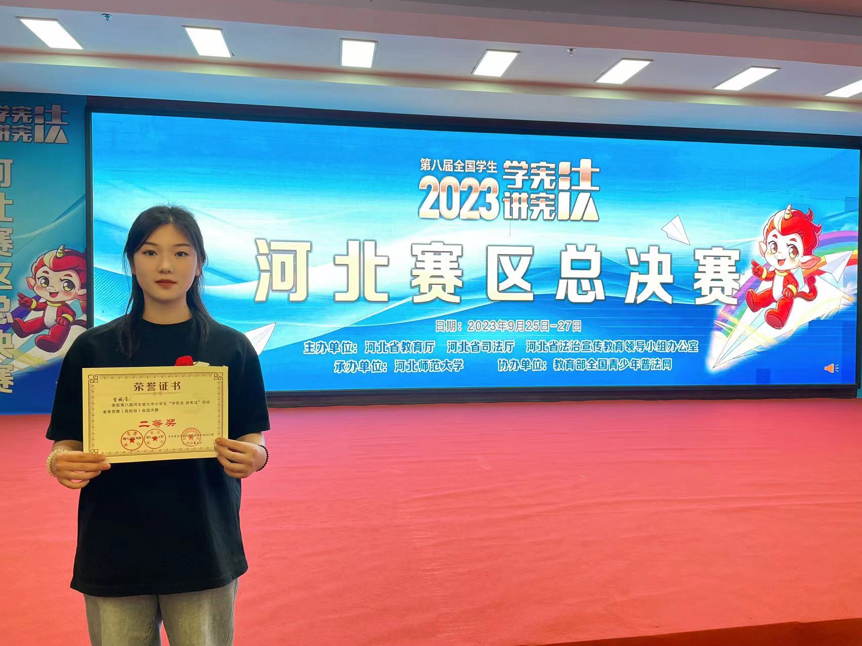 近日,由河北省省教育厅、河北省省司法厅、河北省法治宣传教育领导小组办公室主办,河北师范大学具体承办的第八届河北省学生“学宪法 讲宪法”活动省级决赛圆满落幕。本次比赛,乐天使官网共派两名同学参加比赛。比赛分为演讲比赛和素养竞赛,内容主要围绕宪法及相关法、民法典、未成年人保护法等法律法规展开。演讲比赛包括主题演讲和命题演讲两个环节,素养竞赛采取闭卷形式进行。