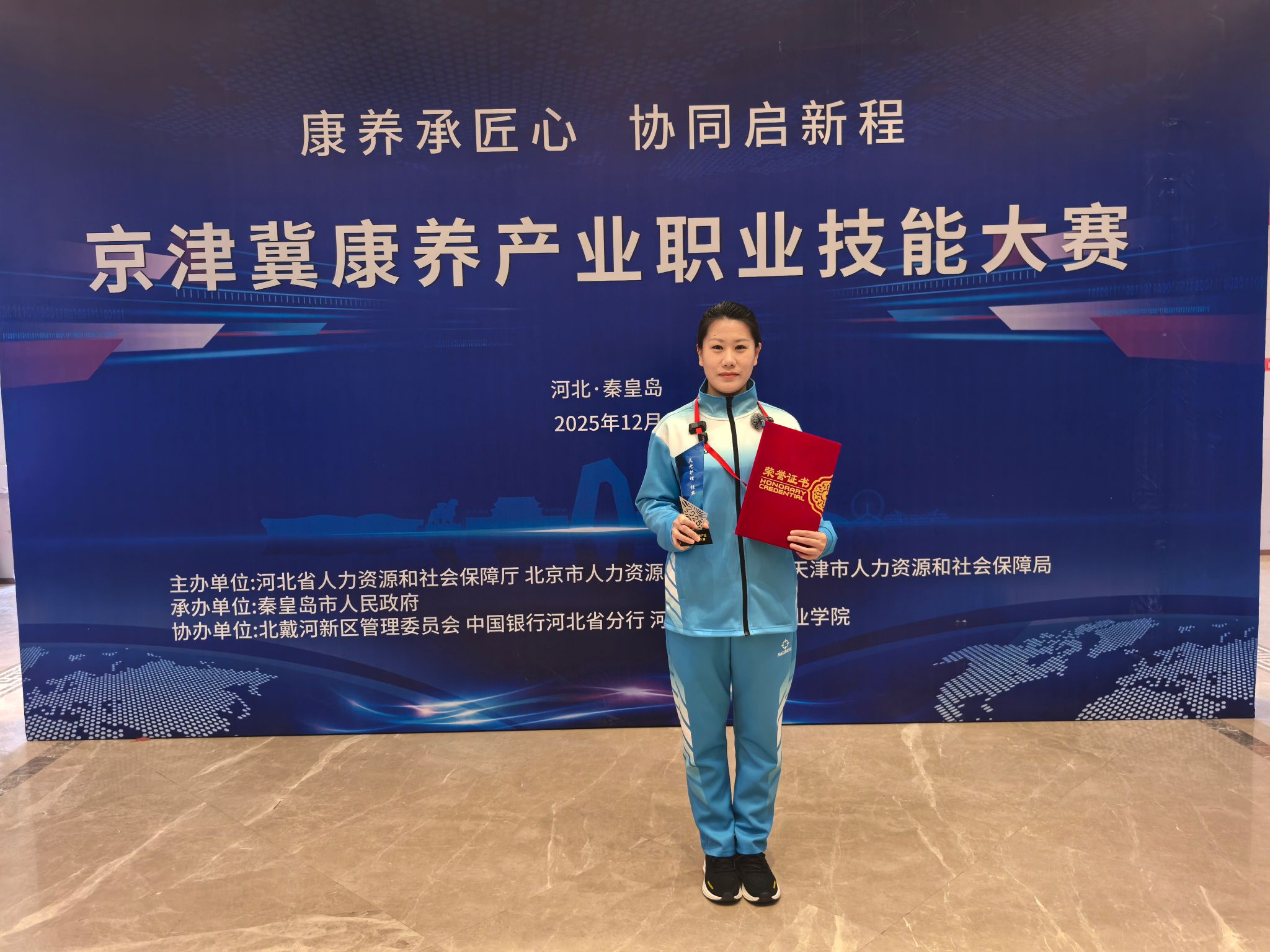12月14日,2025年京津冀康养产业职业技能大赛在秦皇岛落幕,我院护理系教师彭文杰在养老护理项目(阿尔茨海默症)中荣获大赛银牌。(指导教师:张立伟)