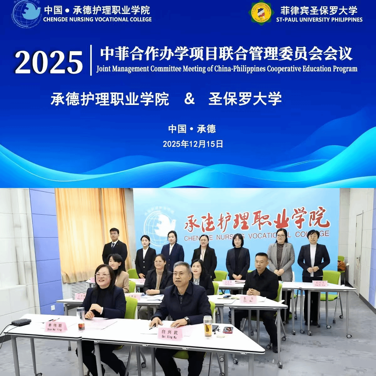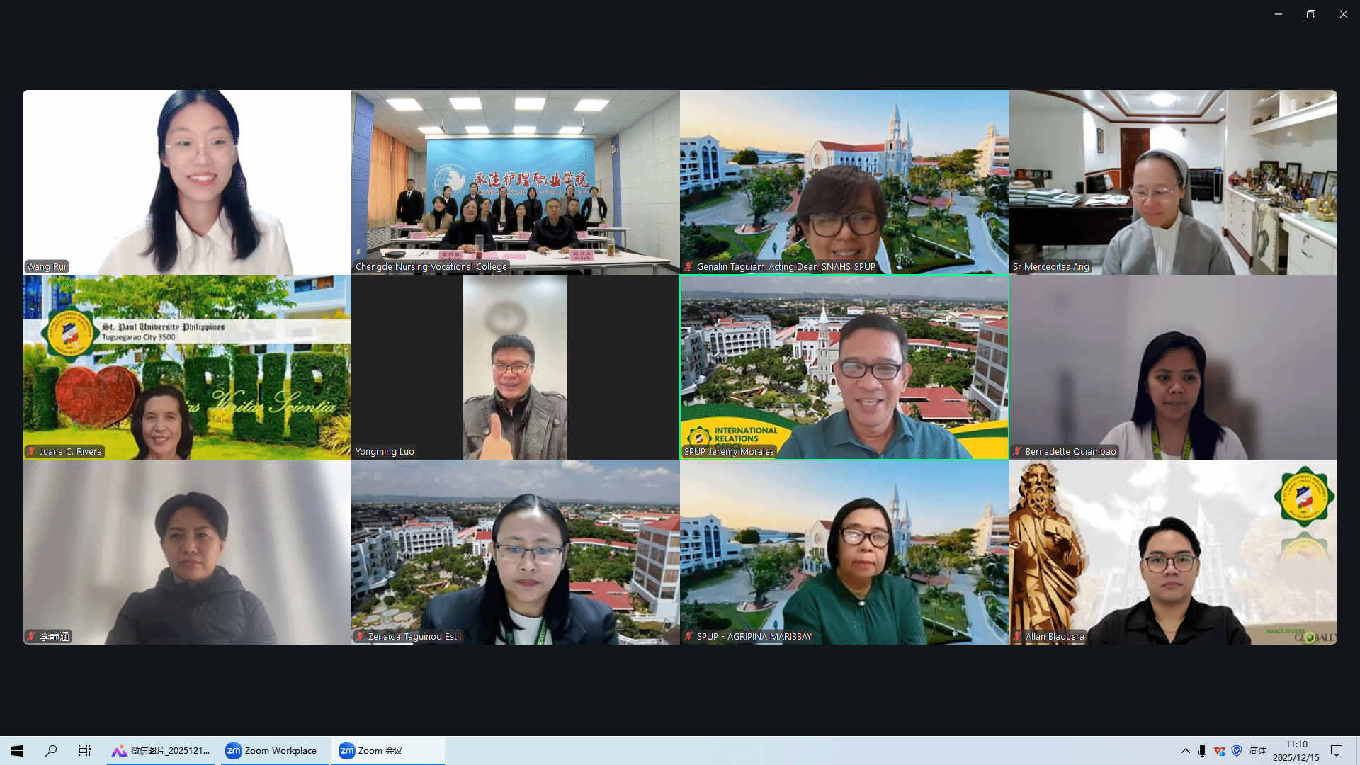 12月15日上午,我院与菲律宾圣保罗大学以视频会议方式召开2025年中菲“3+0”护理专业合作办学项目联合管理委员会会议。院长单伟颖、副院长白兴武,继续教育与国际交流中心、教务处、涉外护理系主要负责人,专业教师代表,英语教师代表以及项目学生代表参会。菲律宾圣保罗大学校长SR. MERCEDITAS ANG.SPC、主管教学副校长DR. AGRIPINA B. MARIBBAY、护理与联合健康科学学院院长MRS. GENALIN TAGUIAM、招生和国际化项目主任DR. JEREMY GODOFREDO C. MORALES、人事处负责人DR. JUANA C. RIVERA、中国学生服务中心主任罗永明等人参会。会议由白兴武主持。