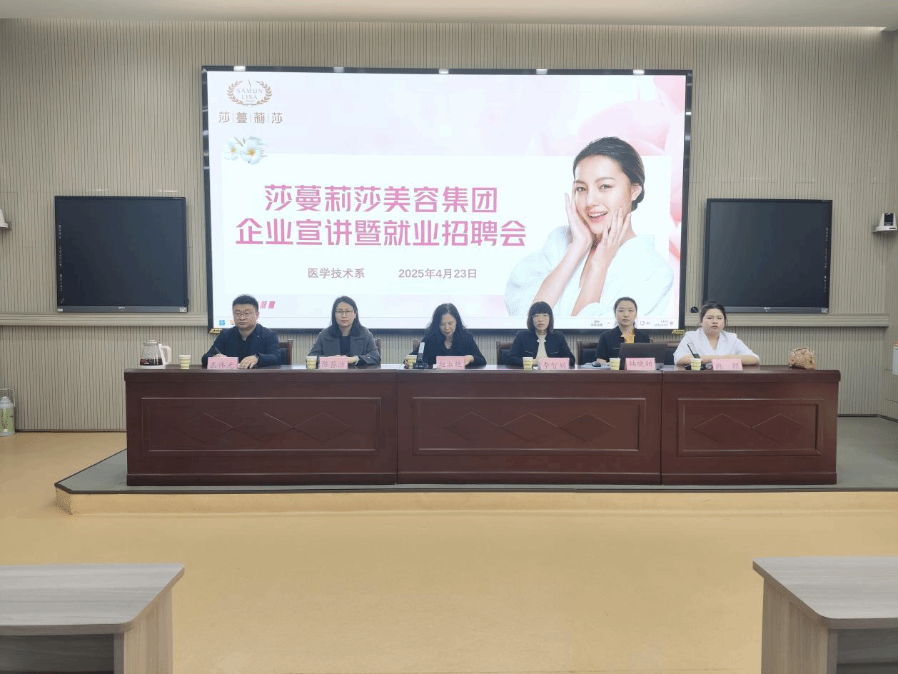 4月23日,北京莎蔓莉莎美容集团人事部部长李智娟、美容技师韩晓甜、韩颖一行三人赴我院医学技术系进行企业宣讲暨就业招聘会,会议在1号报告厅举行。招生就业处负责人陈荟洁,医学技术系书记赵淑艳、副主任岳伟光参加了此次活动。2022级、2023级医学美容技术专业学生通过线上线下联动参与活动。